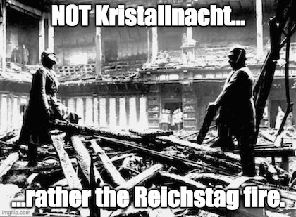 In one week, it has gotten worse. Now we are faced with a lockdown on speech the likes of which have never been seen in America. And the parallels with Germany are even more stark. The left-wing party (the Democrats) and the left-wing media (the “mainstream media”) are using the mob invasion of the Capitol exactly the way the Nazis used the Reichstag fire.