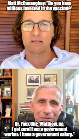 Here’s the juice: Since Dr. Faux Chi assumed his position in 1984, he’s never been called upon to combat a purported pandemic…in other words, actually earn his pay…until now. At which point, he’s taken both sides of every issue so often he makes Kamalaa seem a paragon of single-minded conviction.