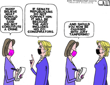 (7). NRO‘s Andy McCarthy highlights how the Dimocrats squandered their impeachment-trial moment, as even he was left wondering: Where were the details of Trump’s actions while the riot raged, and where was the evidence to support their specific charge of incitement?