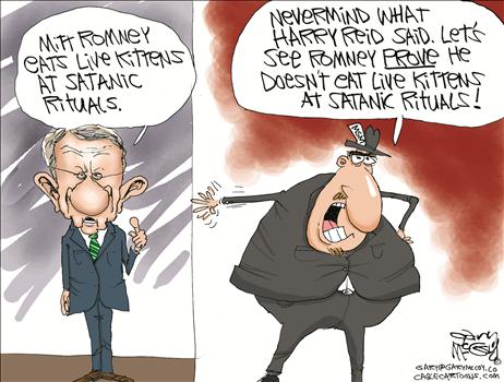 The politics of this squabble are delightful. But Reid has managed to draw both his party and his president into the gutter with him. When Reid accuses the Republicans of being overly partisan, he now lacks all credibility. For a long time it’s been difficult to believe anything he says.Now, it’s impossible.