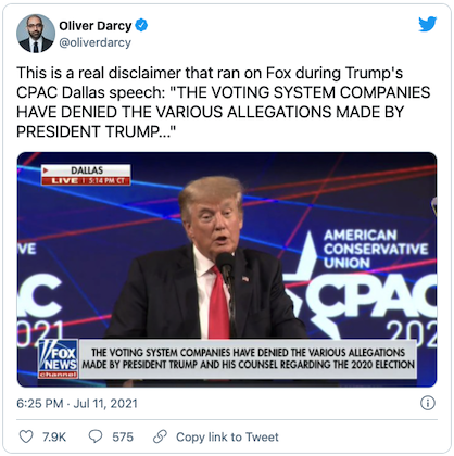 It’s Wednesday, July 13th, 2021…but before we begin, check out the disclaimer plastered across the screen during The Donald’s CPAC speech, then picture…