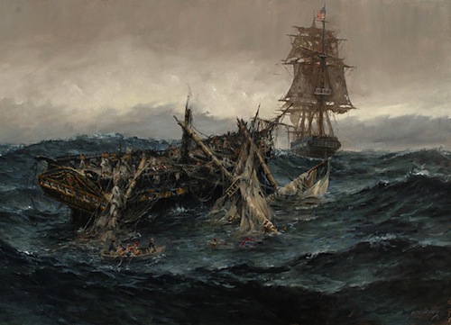 Hull fought a brilliant action; and despite a marked inferiority to the Constitution in both number of guns and weight of broadside, Dacres fought his ship for all she was worth. When one of Hull’s Lieutenants finally boarded the stricken Guerriere to inquire if she had surrendered, Dacres laconically replied, “Well, Sir, I don’t know. Our mizzen mast is gone, our fore and main masts are gone…I think on the whole you might say we have struck our flag.”