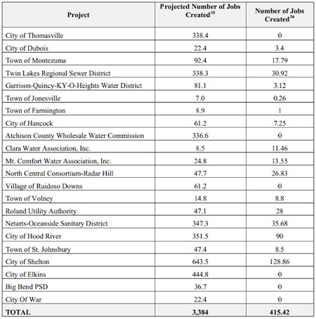 The cities of Elkins, WV; Thomasville, AL; Ruidoso Downs, NM; Big Bend, WV; and City of War, WV, likewise have not created a single job between them, despite having been obligated, with Atchison County, a combined $47 million in stimulus funding through the RUS.
