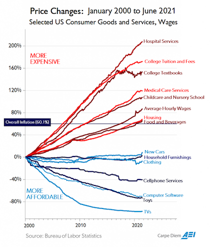 1. The greater (lower) the degree of government involvement in the provision of a good or service the greater (lower) the price increases (decreases) over time, e.g., hospital and medical costs, college tuition, childcare with both large degrees of government funding/regulation and large price increases vs. software, electronics, toys, cars and clothing with both relatively less government funding/regulation and falling prices. As somebody on Twitter commented:
