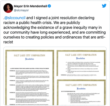 Since the mayor and city council control life in Salt Lake City, and are thus responsible for any racism existing therein, we recommend their first order of business be resigning in favor of anti-racist replacements.