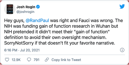 Dr. Faux Chi’s prevarications were so pronounced even WaPo columnist Josh Rogin felt compelled to tweet: