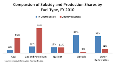 Zooming out for all energy, the Congressional Research Service did its own analysis of tax incentives last year. It found that in 2009 fossil fuels accounted for 78% of U.S. energy production but received only 12.6% of tax incentives. Renewables accounted for 11% of energy production but received 77% of the tax subsidies—and that understates the figure because it leaves out direct spending.