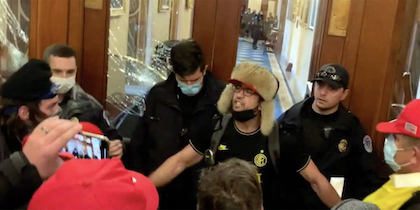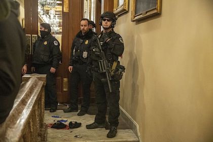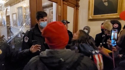 Exhibit “A”: “He said he heard over the radio that rioters had broken into the building, so he and other officers built a makeshift barricade outside the glass doors leading to the lobby of the House of Representatives chamber.”