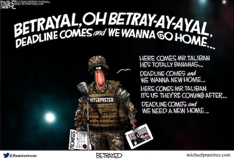 He’s lying, of course. Lying is what terrorists do. Haqqani’s forces can’t protect the Afghan people from ISIS, or, apparently, from the Taliban itself. The Islamic militia is executing civilians and former members of the Afghan National Army, according to the United Nations. And Haqqani’s colleague, spokesman Zabihullah Mujahid, warned Afghan women and girls the other day that they should avoid the outdoors and public spaces, since Taliban soldiers “have not been yet trained very well.” And “We don’t want our forces, God forbid, to harm or harass women.”