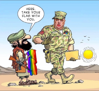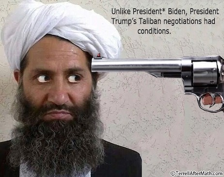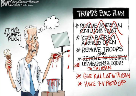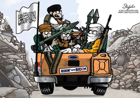 (4). Not that Joe Biden would lie, but writing at the WSJ, one S. Paul Kapur notes, “The Biden administration’s claim that the Doha agreement left no choice but to quit Afghanistan unconditionally is false. Given the Taliban’s behavior, the U.S. wasn’t obligated to withdraw by May 1, by Aug. 31, or any other date.” Truth is, the Trump Administration emphasized the conditional nature of the ill-advised agreement when it was signed, and it’s Biden’s failure to hold the Taliban to said conditions which is responsible for this debacle. Which, as this cartoon from Speed suggests, earned The Groper a well-deserved…