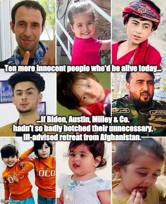 …Because Barack Obama had at least the good sense to more or less ignore Joe Biden out of existence for eight years, Osama bin Laden did not live to see his expectations finally come to pass. But a symbolic retaliation followed by retreat is precisely what President Biden ultimately intended to offer, at the end, in Afghanistan. After the airport attack — the deadliest attack on U.S. forces in Afghanistan in a decade — President Biden was politically compelled to do something, lest his Big Man Mojo be seen to wane and the Mandate of Heaven slip from his quavering grasp. That compulsion surely was felt all the way down the chain of command. And it resulted in taking the first opportunity to make atheatrical show of force — in this case, against a car with seven children in it.