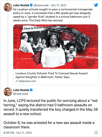 Here’s the juice: First, consider The Daily Wire tweet featured above confirming not only did Loudoun County education authorities KNOW of the assault on Smith’s daughter at the time they denied it ever happened, learning nothing from the experience of the Roman Catholic hierarchy, they then transferred the sex offender to another school, where he repeated his assault!!! Second, understand THESE are the depths to which Progressives are prepared to sink to preserve their perverted policies.