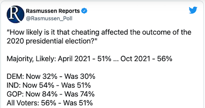 “ARasmussen Reports pollreleased earlier this week showed that a majority of likely voters think cheating affected the 2020 presidential election.What’s more, this number has increased not only with all voters, but Democrats, Independents, and Republicans.(Editor’s Note: ?)According to results from October 56 percent of all likely voters believe that “it is likely that cheating affected the outcome of the 2020 presidential election,” including 41 percent who say it’s “very likely.”…”