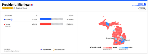 Look at the numbers and do the math for yourself. 1% of 5.5 million votes is 55,000 votes, which is the approximate total of fraudulent votes Michigan officials have identified thus far. 46*’s margin of “victory” in Michigan was about 2.8%, so it wouldn’t take an awful lot of unidentified fraud…say, in Deetroit…to swing the election. Besides, does anyone really think Wretched Gretchen’s bureaucrats are looking that hard?!?