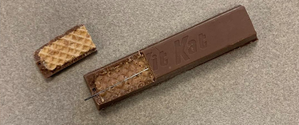 At the risk of seeming a conspiracy theorist, something ain’t right. Sorry, but if we were going to lace a Kit Kat with a sewing needle with serious intent to inflict bodily harm, we wouldn’t leave the end of the needle exposed for all to see.