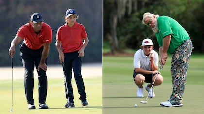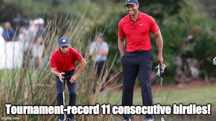 “…Woods and his 12-year-old son strung together a tournament-record 11 consecutive birdies and pushed John Daly and his son John Daly II, a freshman golfer at Arkansas, to the finish.