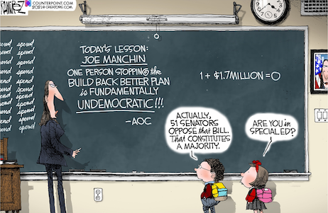 Senator Joe Manchin, the moderate Democrat from West Virginia who is one of the last of that breed, has derailed Joe Biden’s beloved Build Back Better bill, a slop-bucket of progressive wish-fulfillment that would add trillions in new spending to our already-bloated federal budget and pile much more debt upon our already-considerable national heap. Senator Manchin thought it was a bad package, though he supported some of what was in it, and West Virginians thought it was a bad package, though they supported some of what was in it, and so Senator Manchin announced — on Fox News, in an extra “f**k you” to Chuck Schumer et al. — that he would oppose the bill. Because Democrats and Republicans both have rejected the notion of consensus-building and bipartisanship, every Senate Republican opposes the scheme, which means that the Democrats need every Democratic vote to pass the bill in the evenly split Senate.