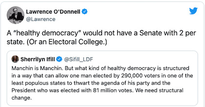 I know as well as anybody that poor, rural, white America has its problems. But I do not believe for one hot second that Ilhan Omar or Robert Reich knows one damned thing about them, or cares to learn. Why would they? Senator Manchin is about as far to the political left as today’s West Virginia is going to go. Owsley County, Ky., home of the poorest white people in America, is overwhelmingly Republican, and Donald Trump got eight times as many votes as Joe Biden did there in 2020 — Trump did slightly better inSan Francisco than Biden did in Owsley County.There’s a little factoid to meditate upon.