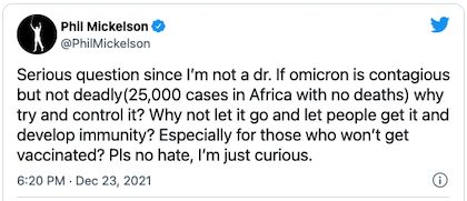(5). In a related item, the Morning Jolt details why government WuFlu mandates make no sense against the Omicron variant. Then again, as we mentioned to TLJ over dinner, neither has any other aspect of government responses to the man-made virus China loosed upon an unsuspecting world.